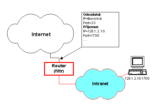 Kombinac9 filtrace protokolu IP a protokolů TCP/UDP je možné stanovit, aby konkrétní počítače mohly mezi sebou komunikovat pouze konkrétními aplikacemi. Navíc je možné filtrací zajistit, aby klienti určité aplikace z vnitřní sítě mohli využívat serverů v Internetu a přitom naopak, aby cizím klientům byl znemožněn přístup do vnitřní sítě. Např. aby se klienti z vnitřní sítě dostali na WWW-servery v Internetu, ale aby cizí klienti se nedostali na WWW-servery vnitřní sítě.