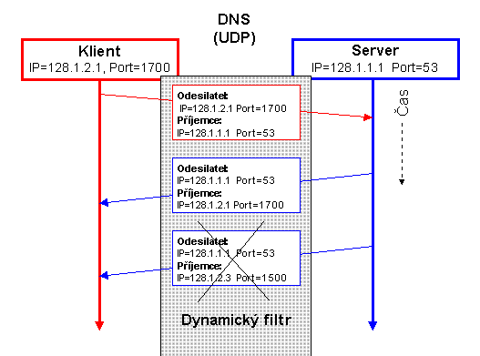 Dynamickou filtraci si objasníme na následujícím obrázku. Klient posílá UDP-datagramem na DNS server dotaz, ve kterém je žádost o překlad jména na IP-adresu. Filtr UDP-datagram směrem ven propustí, ale poznamená si IP-adresu a port odesilatel a IP-adresu a port příjemce. Po určitý časový interval nastaví filtr v opačném směru pro odpověď. V odpovědi je zaměněna IP-adresa a port odesilatele a příjemce. Odeslal-li by protějšek UDP-datagram ještě jinému počítači ve vnitřní sítí, pak je tento datagram zahozen.