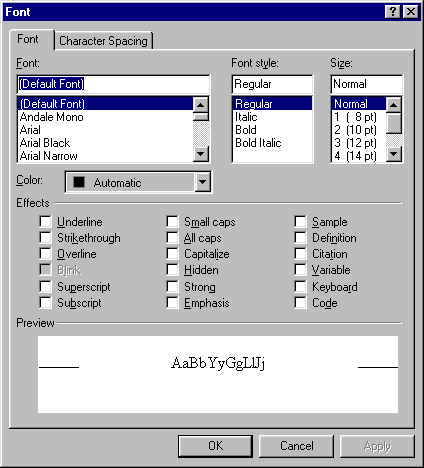Autoři stránek většinou chtějí mít všechny odstavce nebo nadpisy stejným písmem. Na to jsou ale určeny styly, které popisuji dále. Nastavovat písmo pro celý dokument tím, že stokrát použiji příkaz Format - Font, je neefektivní pakárna.