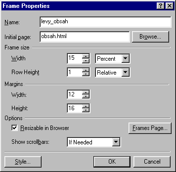 Frame size -- velikost rámu je důležitá. Dá se sice nastavit taháním myší, ale to není vždy spolehlivé. Může se zadat šířka a výška, ale zhusta se některá z hodnot nechává relativní. Relativně rozměrovaný rám se zobrazí tak velký, kolik zbude místa.
