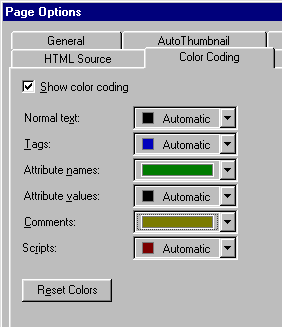 Programátorům a autorům HTML velmi usnadňuje práci barvení textu podle jeho významu, protože je to potom přehlednější. Barvení se dá nastavit příkazem Tools - Page Options - Color Coding.