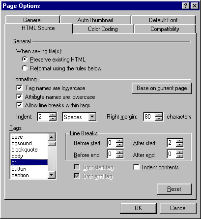 Nastavuje výslednou úpravu HTML kódu, která ale také nemá skoro žádný vliv na výstup stránky. Jedinou (ale někdy značnou) výhodou je větší přehlednost kódu podle uživatelova nastavení. Jedinou nevýhodou je to, že volba "reformat" mění některé věci v zápisu stylů podle sebe, ale navzdory záměru autora (např. CSS vlastnost border).