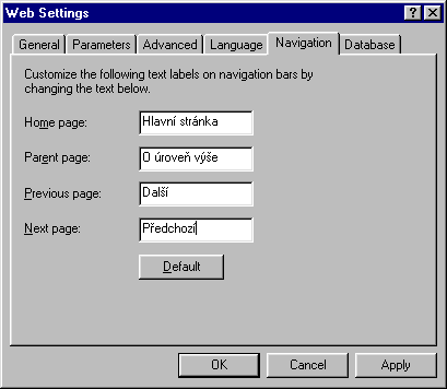 Některé volby obsahu baneru potřebují navolit texty pro tlačítka. Dělá se to příkazem Tools - Web settings - Navigation:
