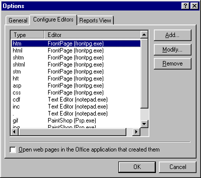 Systém Windows má u každého typu souboru nastavený výchozí editor. V prostředí FrontPage se ale soubory mohou otevírat v jiném programu. Jinými slovy FrontPage má vlastní asociace. Je to vcelku užitečné.