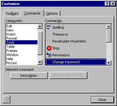Jakmile se zadá Tools - Customize (nebo View - Toolbars - Customize), ocitá se FrontPage ve zvláštním režimu, ve kterém lze měnit tlačítka na panelech.