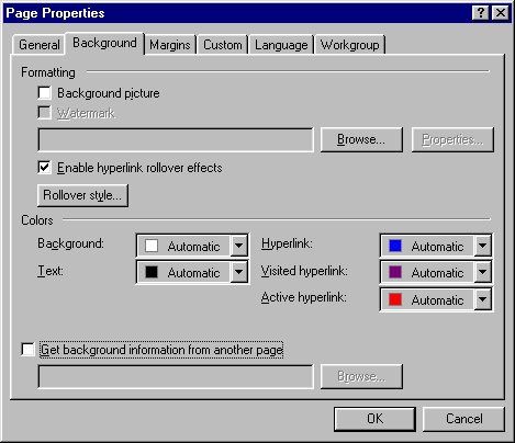 Je dobré mít na všech stránkách webu stejné barvy písma a pozadí (nebo aspoň na většině stránek). Ta spodní volba Get backround ... page je vcelku dobrá vychytávka. Doporučuji udělat si pomocnou stránku, nastavit jí barvy a všem ostatním stránkám ve webu zadat tu pomocnou jako zdroj barev. Má to jenom tři záludnosti: