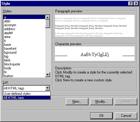 Možná chápete, že největší problém předchozího příkladu je, jak mám vědět, že odstavec je "p". FrontPage, který po uživateli normálně nevyžaduje znalost HTML, se zde chová dost nešikovně. Co když budu chtít nastavit formát pro odkazy nebo seznamy? Prostě musím znát jména tagů jednotlivých prvků stránky a najít si je v tom levém sloupečku (Styles). Naštěstí těch opravdu důležitých tagů není moc, naučte se je: