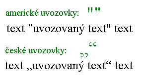 V anglosaském světě se používají "rovné" uvozovky, u nás se používají uvozovky „kulaté“. Počáteční kulaté uvozovky mají "tvar" 99, koncové 66.